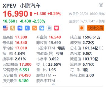 格隆汇2月5日|小鹏汽车(XPEV.US)盘前跌超2.5%,报16.56美元。消息面上,小鹏汽车宣布,为推动智能驾驶及“油智同价”的发展,推出零首期及五年零利息金融政策。以小鹏X9为例配资炒股配资网站,利息补贴最高达到5.7万元。